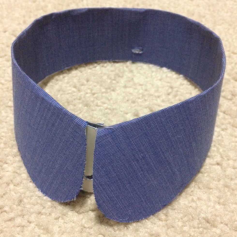 Cotton and paper collar made by me from fabric from an old blue shirt and craft paper.