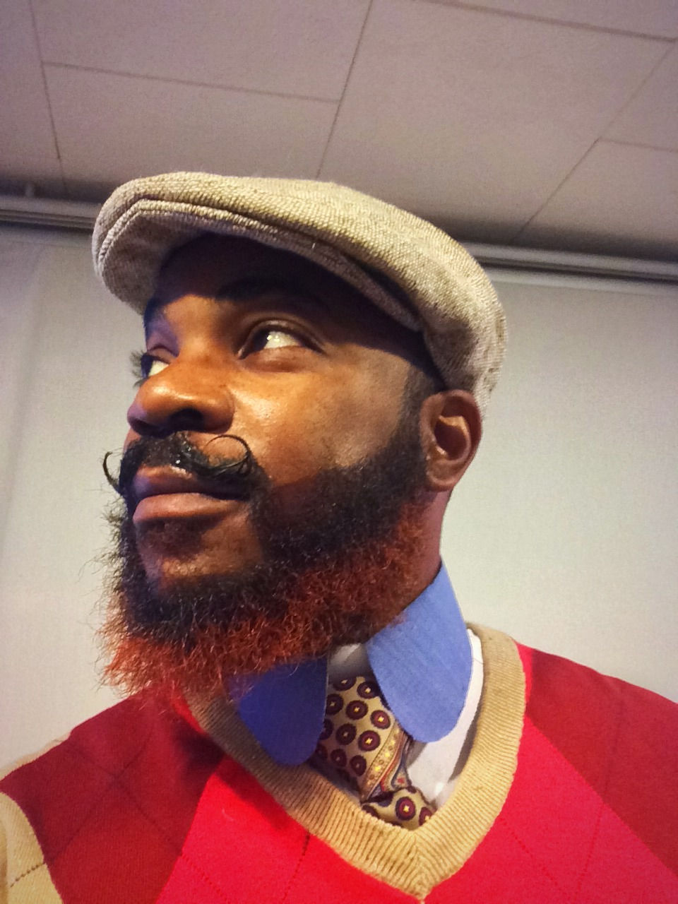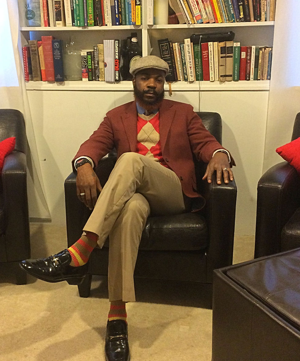 I love this tie with unconventional color scheme of Tan, Red, Blue and yellow. The tie brings together the colors in the sweater and, Socks, Purchased for $2 at The Arc as well.